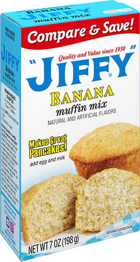 “JIFFY” Banana Muffin Mix is made with real banana and bakes into a tasty, golden muffin. This mix is easy to prepare and makes great pancakes & waffles. Get your family together and create after-school snacks, aromatic breakfast sides, one of our many delicious “JIFFY” recipes, or your own signature treat.