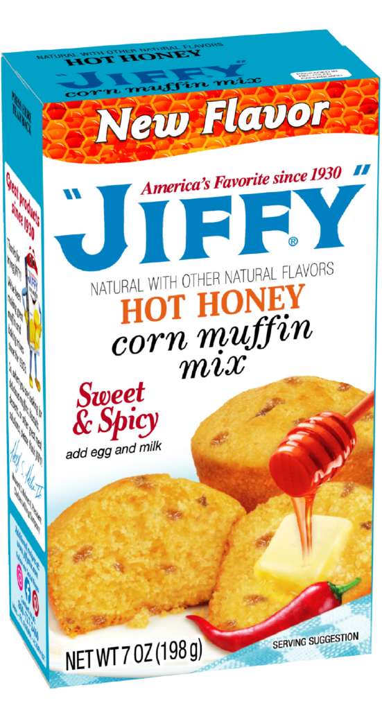 Cornbread (Johnny Cake) gets a bold new upgrade with “JIFFY” Hot Honey Corn Muffin Mix! Quick, easy, and infused with the perfect balance of sweet heat for a delicious addition to any meal.